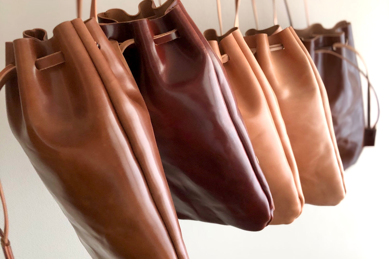 また、内張りや内装のポケットなどは一切省いて、シンプルな本当の巾着を作りました。その分、革そのものの良さを感じられる作りです。