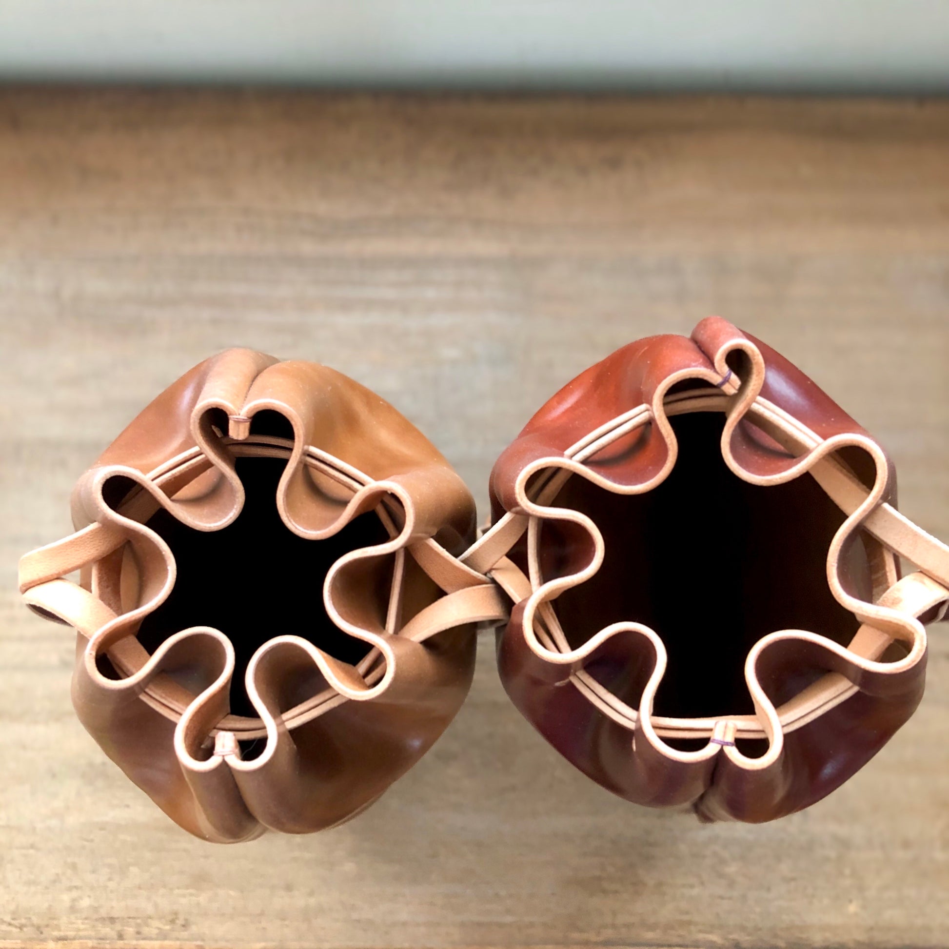 • 使い初めのうちは、革の抵抗で巾着の開閉がしにくいかと思います。