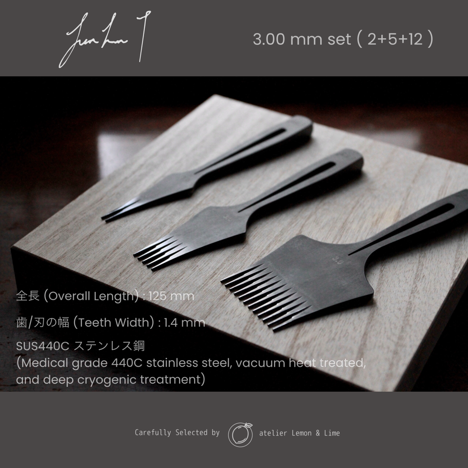 atelier Lemon & Lime でセレクトしたヨーロッパ目打ちの3ブランド、4種類の、それぞれの歯(刃)の幅を一覧にしました。ご確認ください。