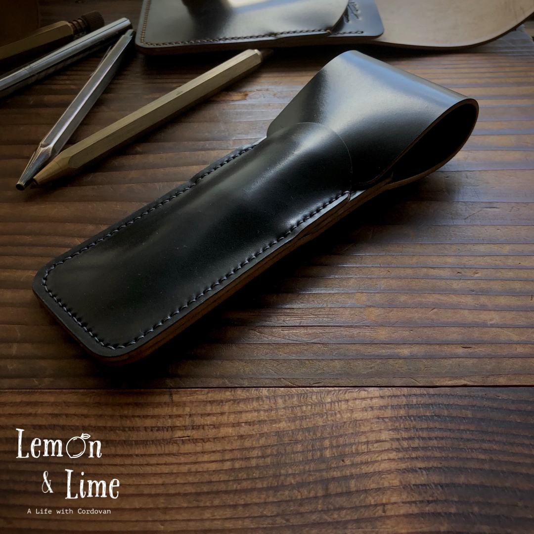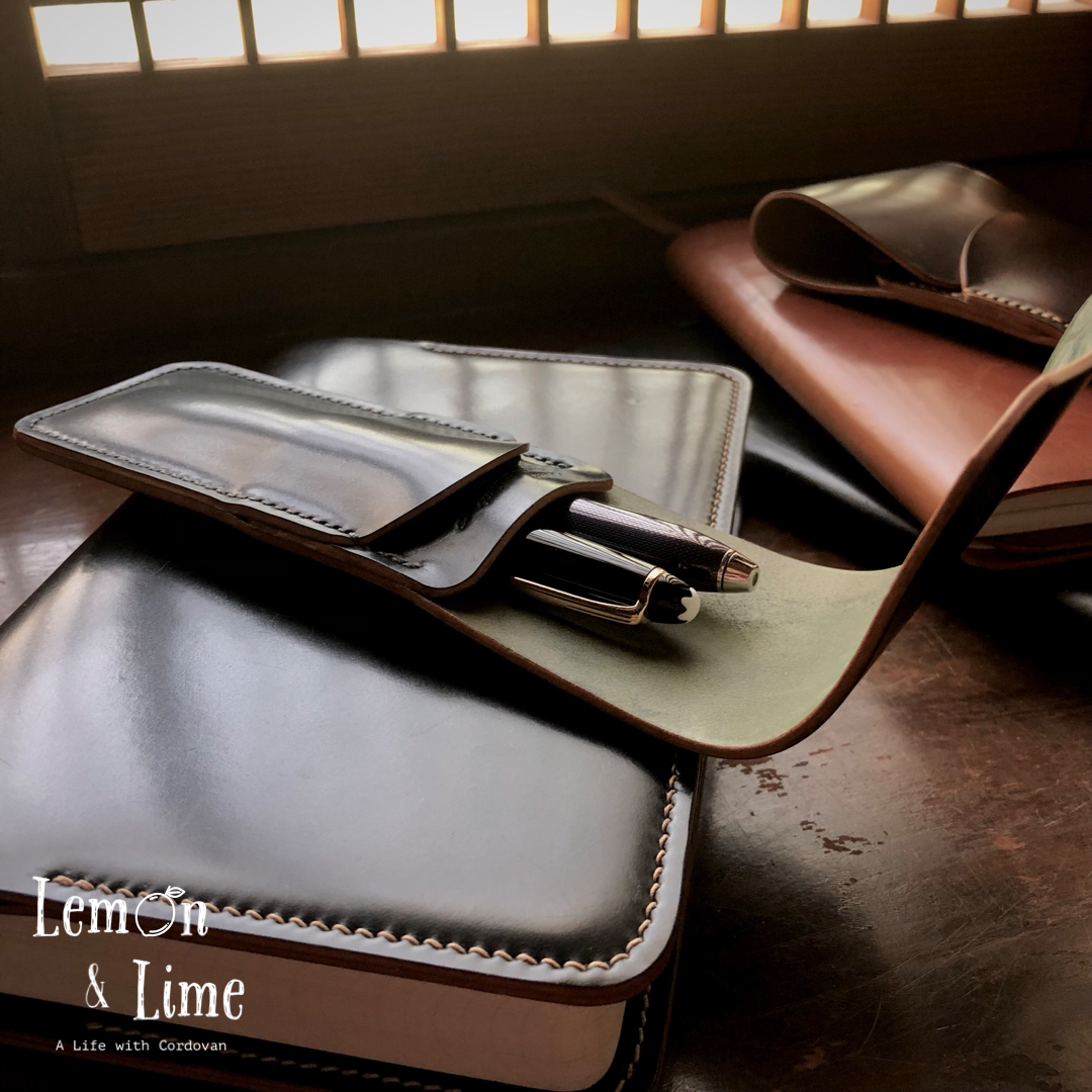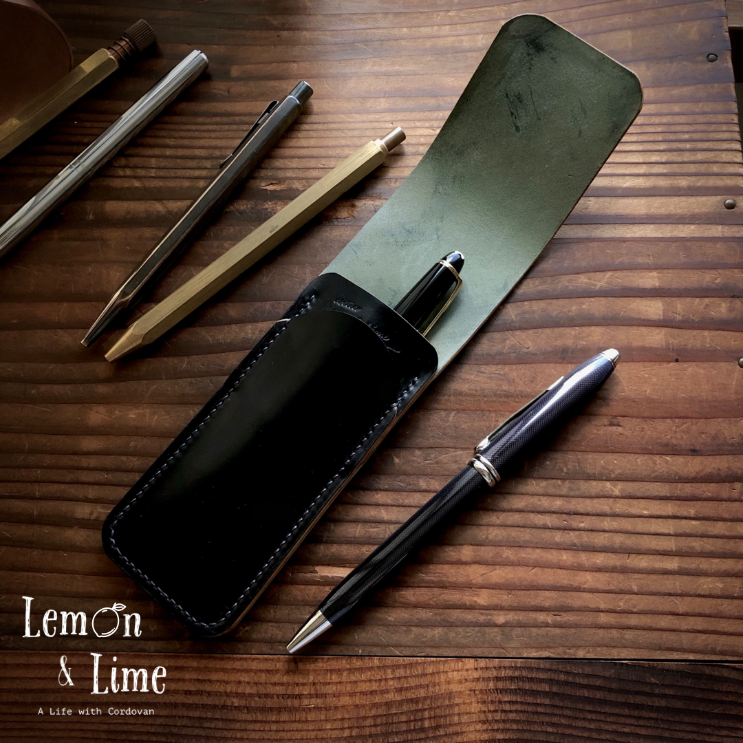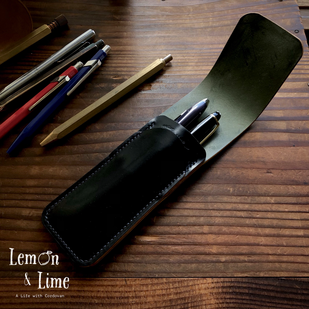 Horweenシェルコードバンで製作した、ペンが2本ほど入るサイズのフラップ付きのペンケースです。