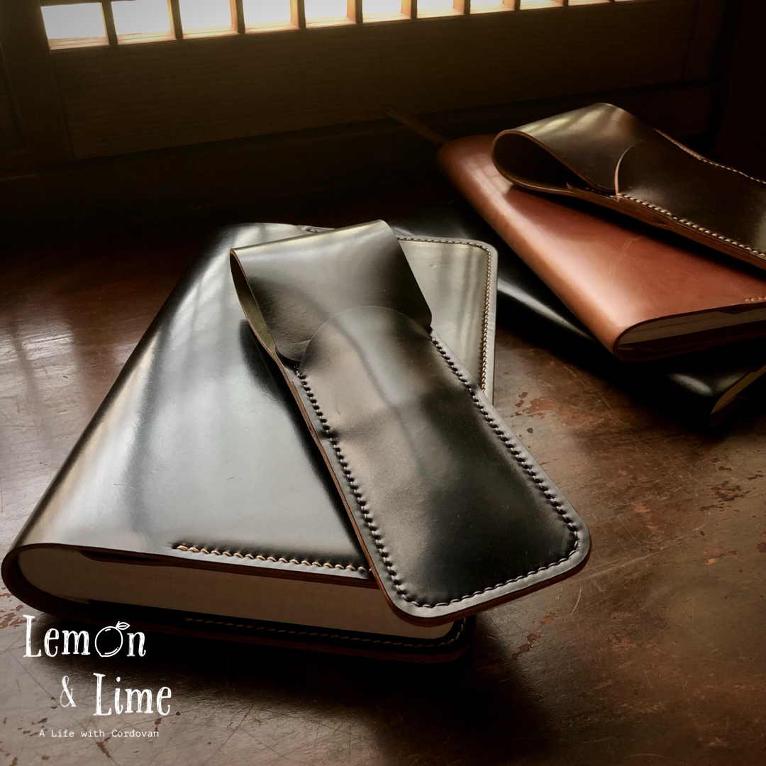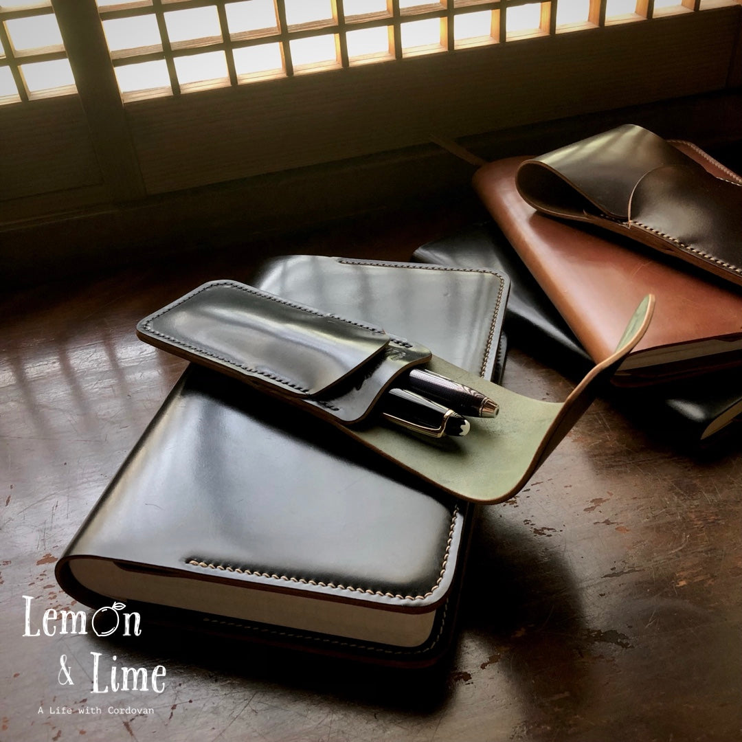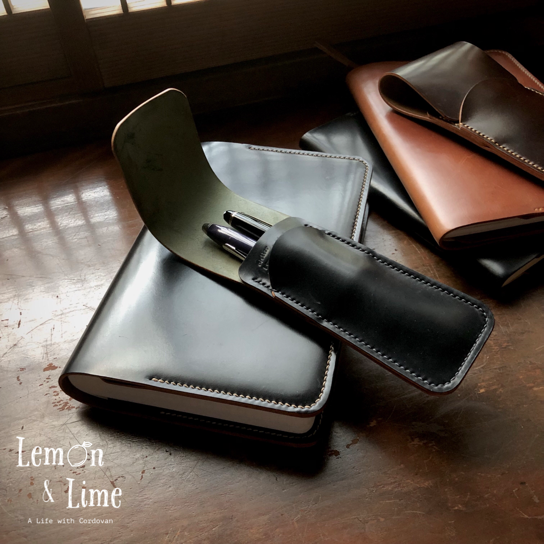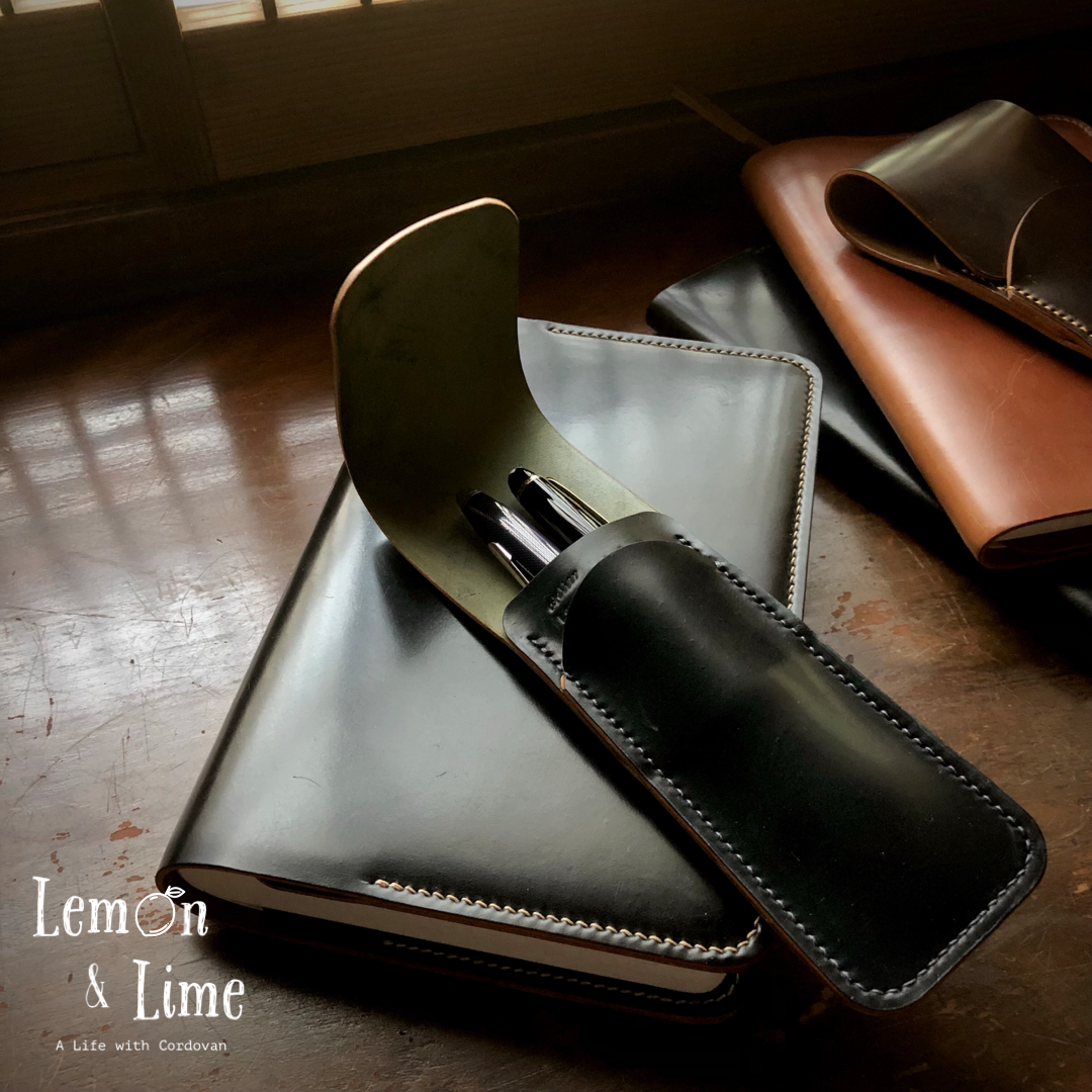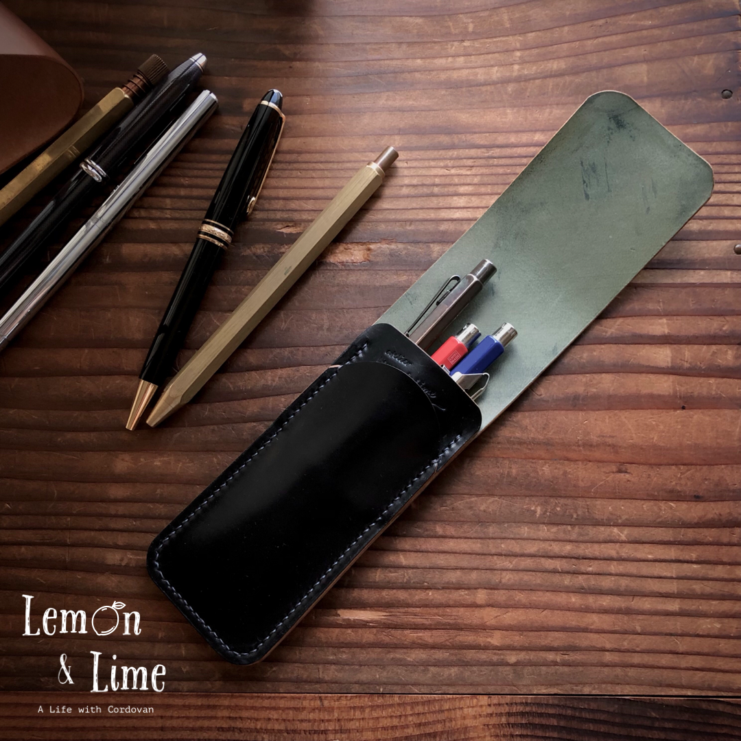 Horweenシェルコードバンで製作した、ペンが2本ほど入るサイズのフラップ付きのペンケースです。