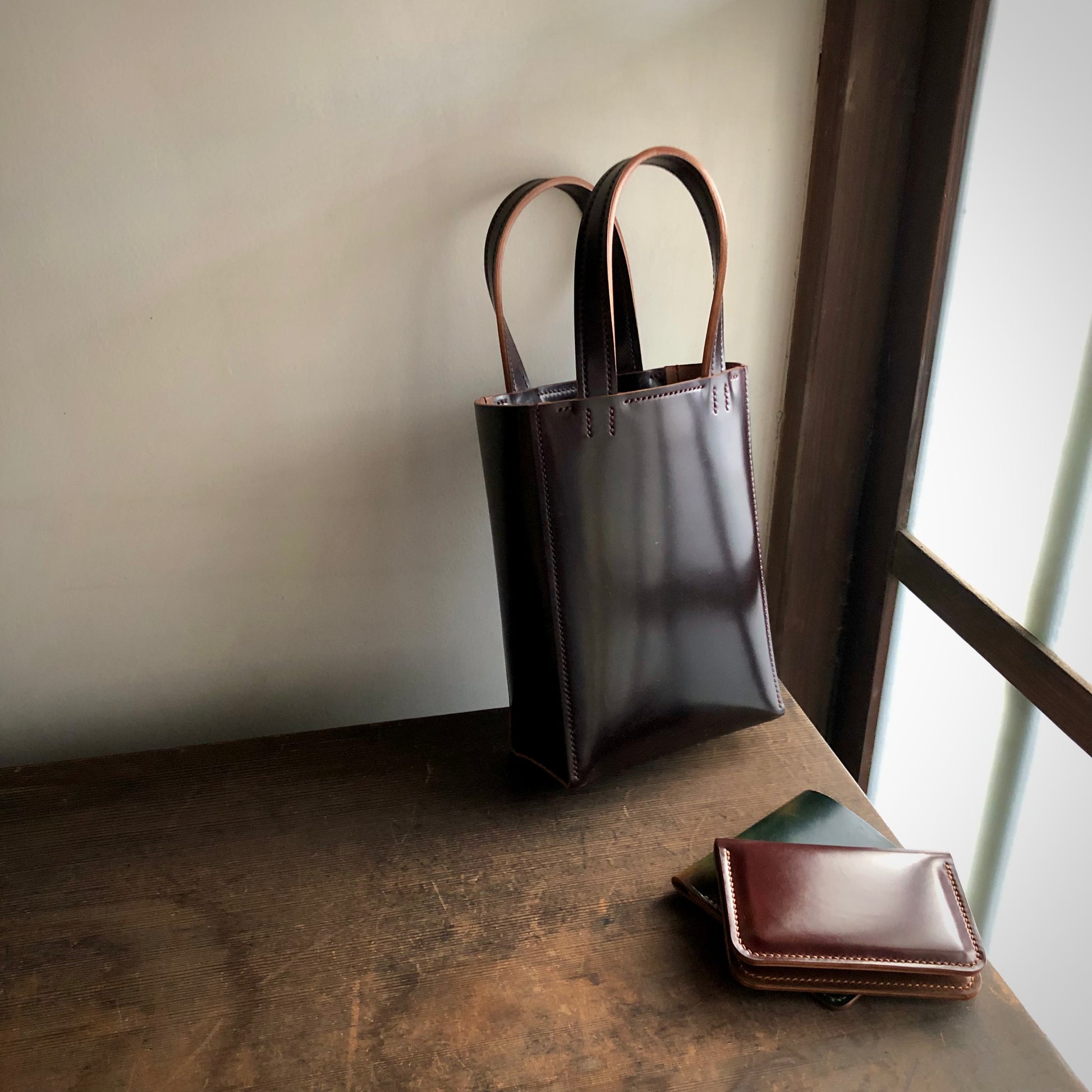 コードバンのみを使用して仕上げたミニサイズのたて型トートバッグです。すべて手縫いで製作しています。