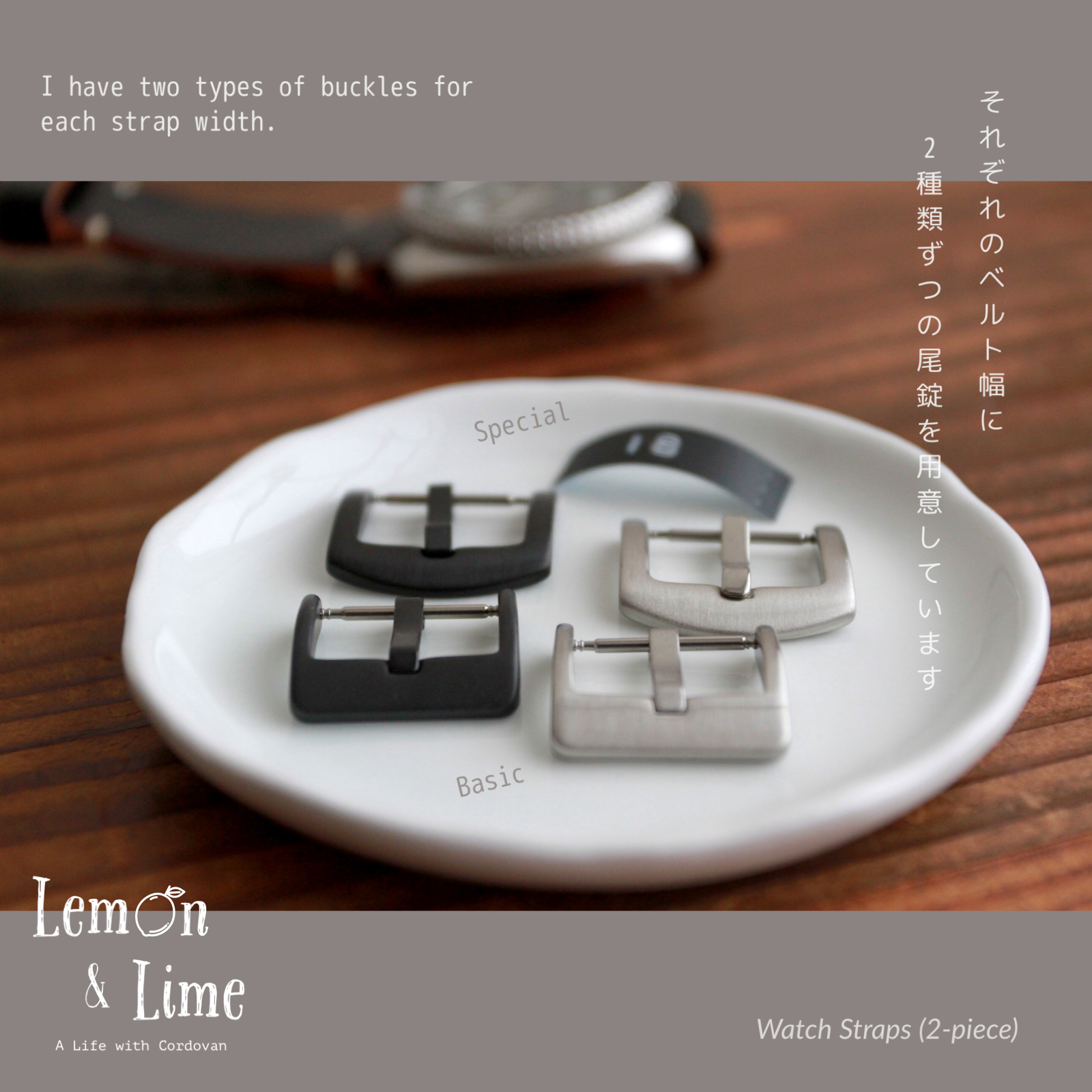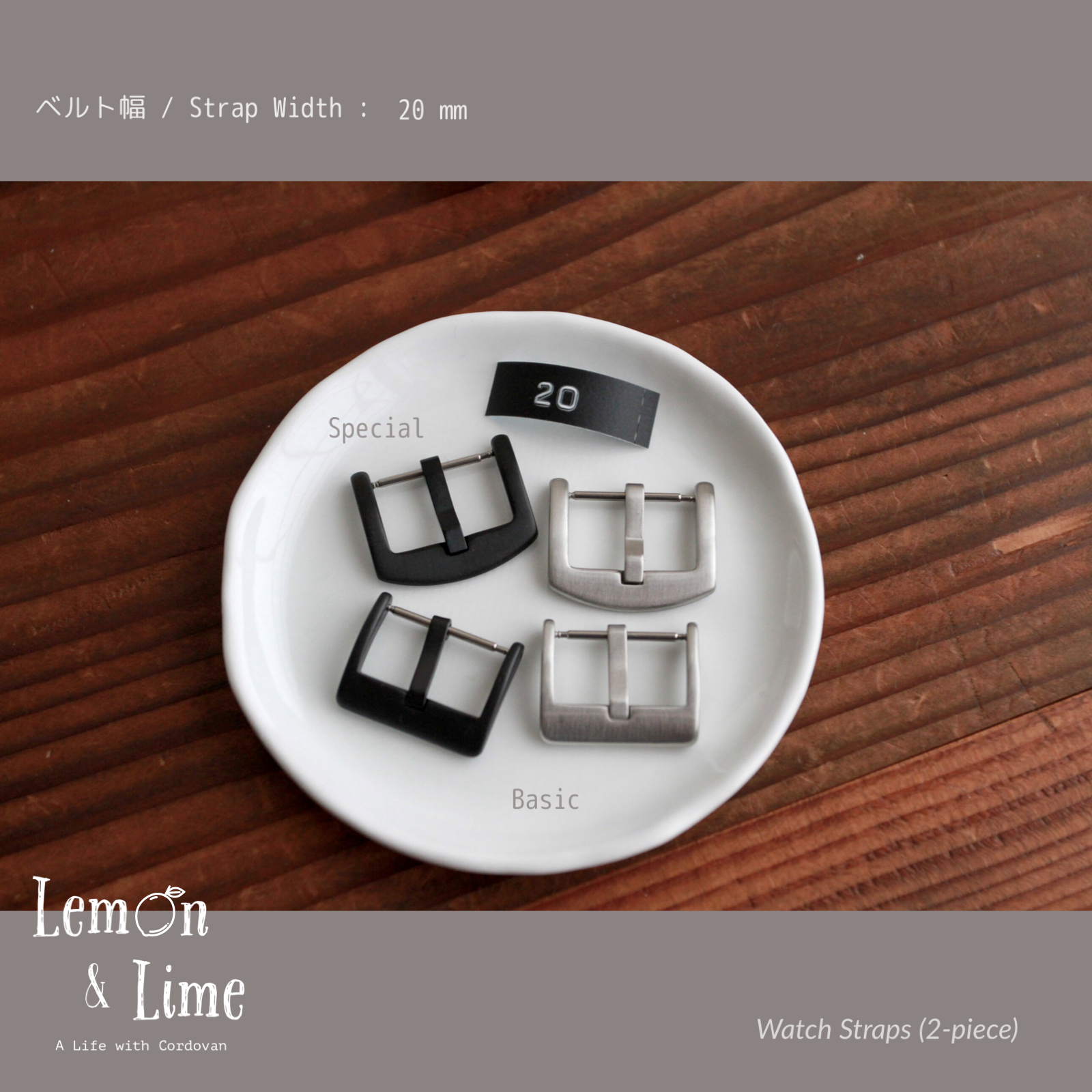 尾錠の形状は、それぞれのベルト幅に2種類ずつ用意しています。